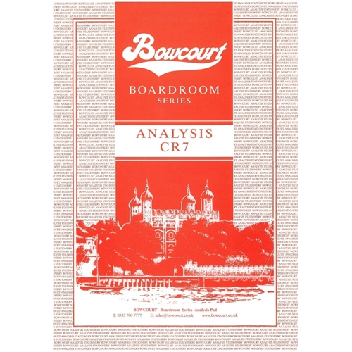 (BOWCOURT) Boardroom 100 leaf A4 pad with board back and cover. CR7, 7 column, headed, single-sided, print in grey. All our accountancy pads are drilled with 2 holes 8cm apart on the left side unless otherwise requested. A Personalisation Service is available, minimum order is 50 personalised pads, prices as above, carriage is applicable. Boardroom Series Pads are also available in Loose Leaf sheets, Packed in Reams. Please call Sales Office for details.